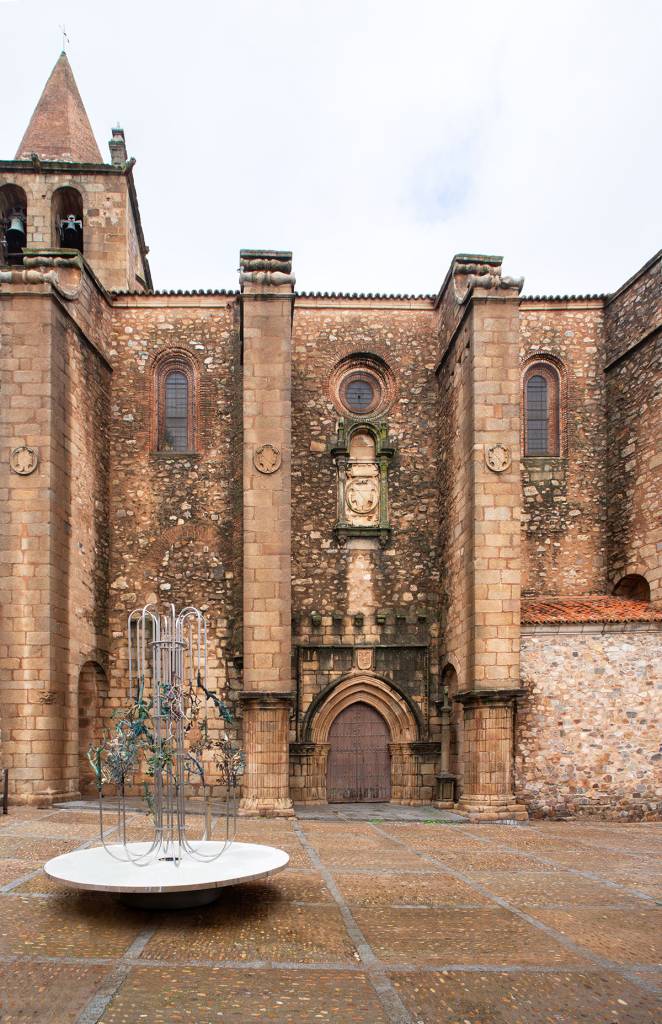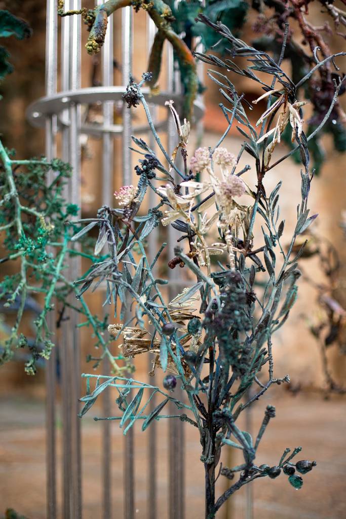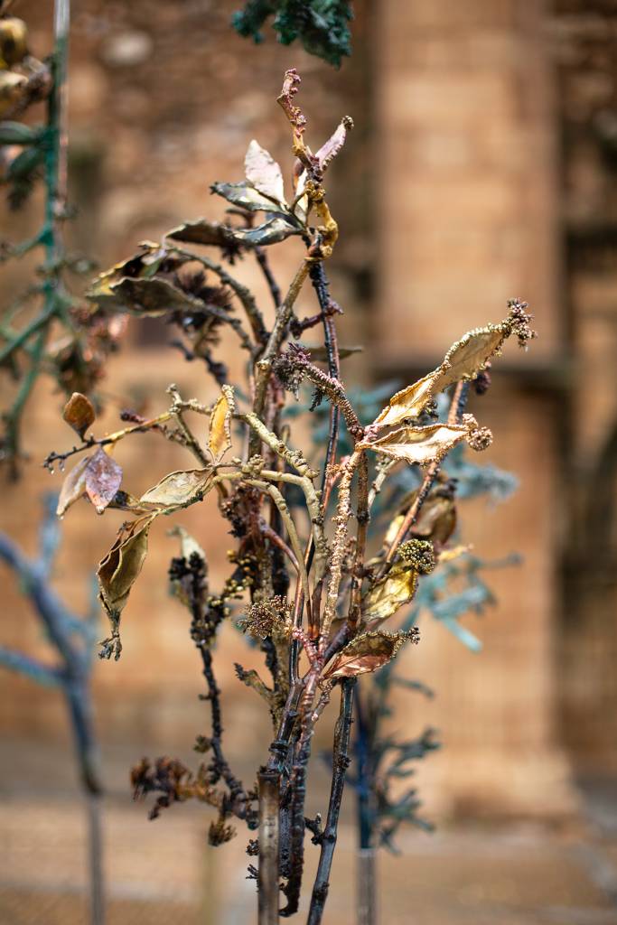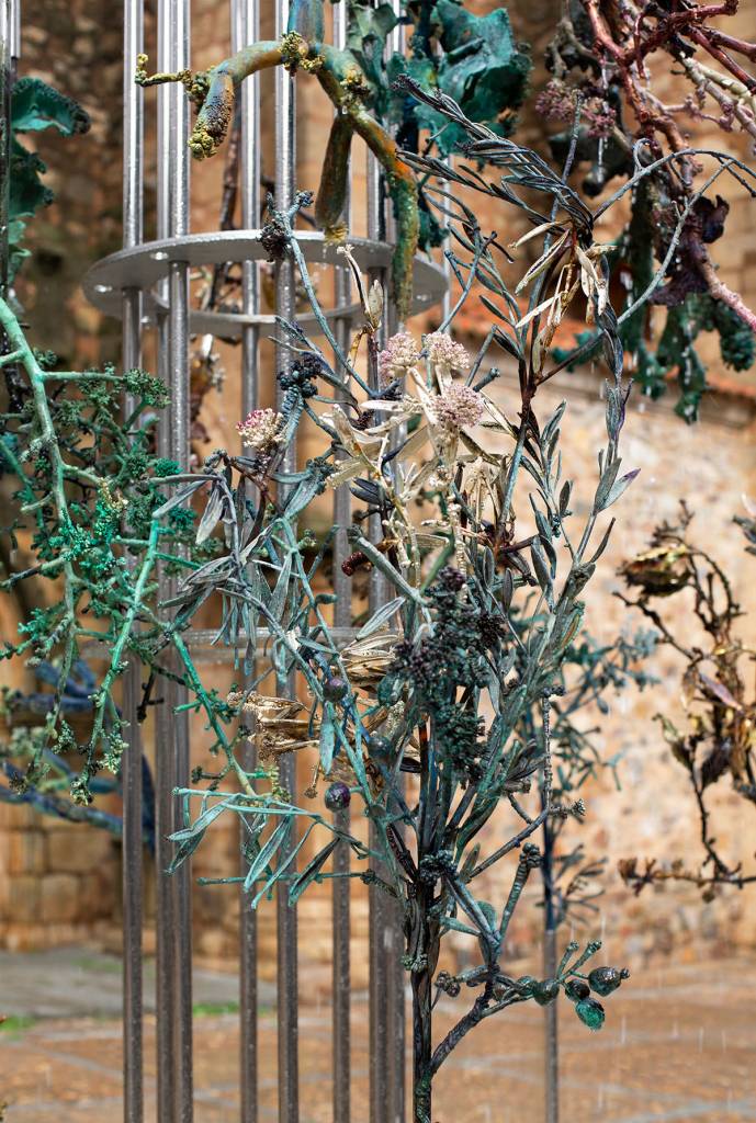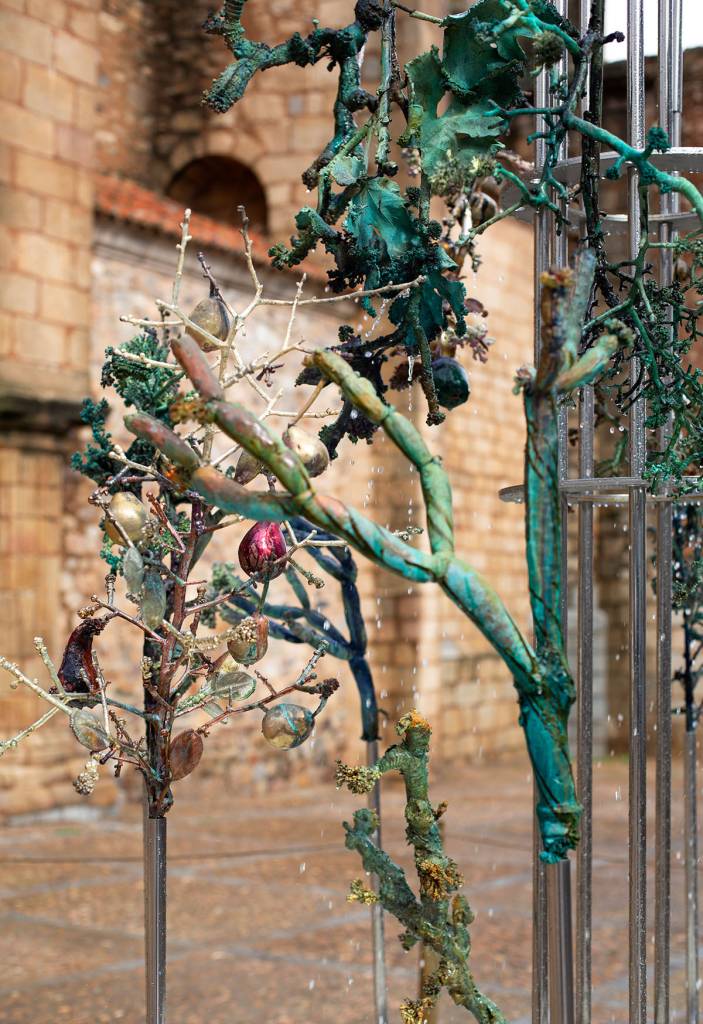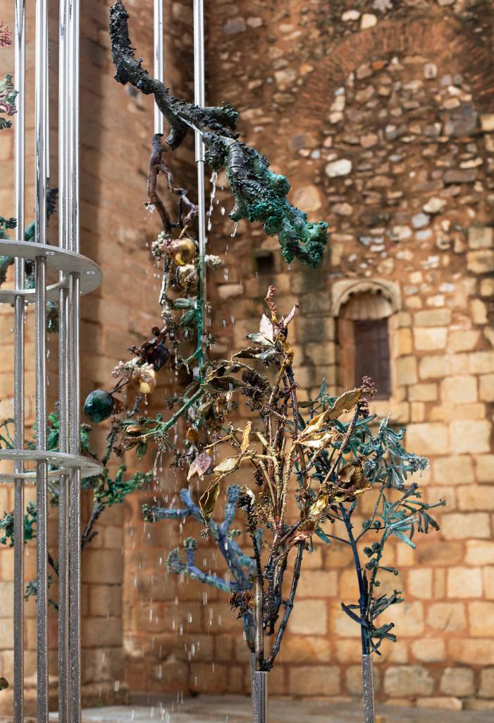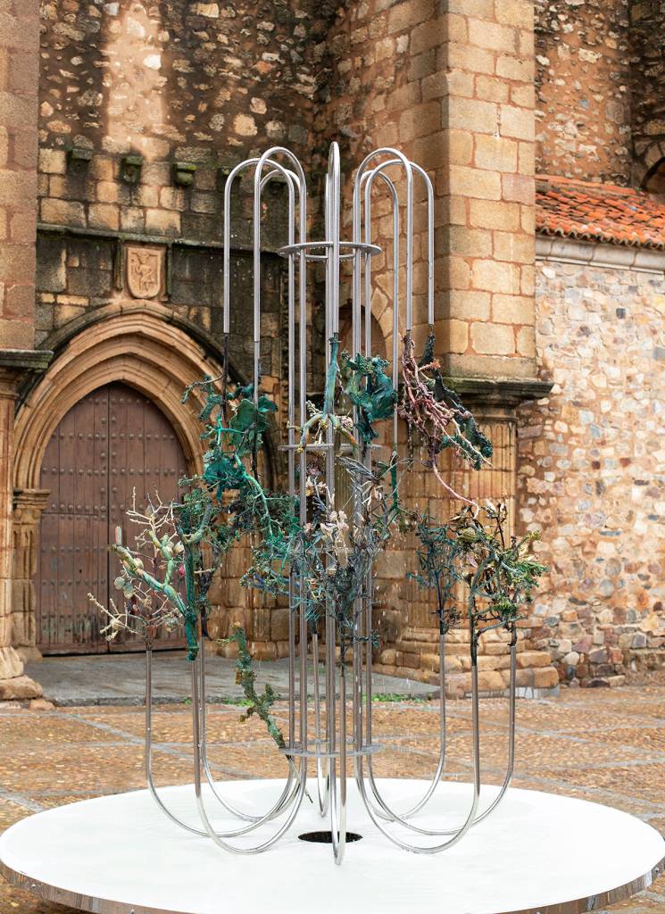La instalación se enmarca en una investigación en torno a los saberes materiales premodernos, los sistemas simbólicos vegetales y las formas de transmisión popular asociadas al territorio de Cáceres. No parte de la representación de una leyenda concreta, ni busca construir una narrativa cerrada. En lugar de ilustrar un mito, esta obra adopta las lógicas estructurales de los mitos mismos. La fuente no enuncia una historia: se comporta como una red simbólica donde el tiempo, la materia y el entorno actúan como agentes activos de transformación.